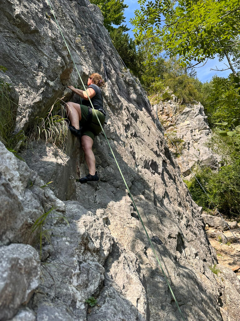 Schnell ein Seil eingehängt in die Mitte der Wand und schon kann es losgehen. Nina wird wieder eingespannt zum Sichern, einfach, weil sie mittlerweile schon Profi ist.