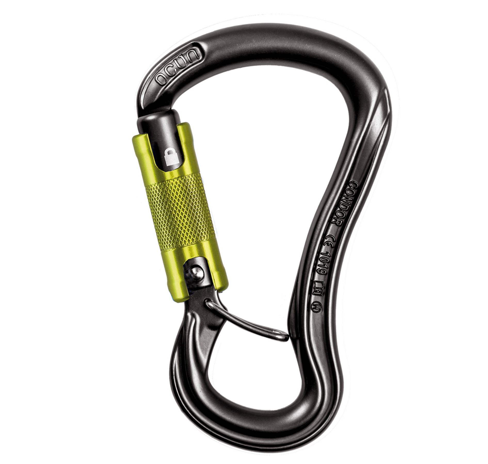 Der Condor funktioniert bestens mit einem Sicherungsgerät. Dabei sorgt der kleine Drahtbügel am schmalen Karabinerende dafür, dass sich der Karabiner nicht unbeabsichtigt dreht.